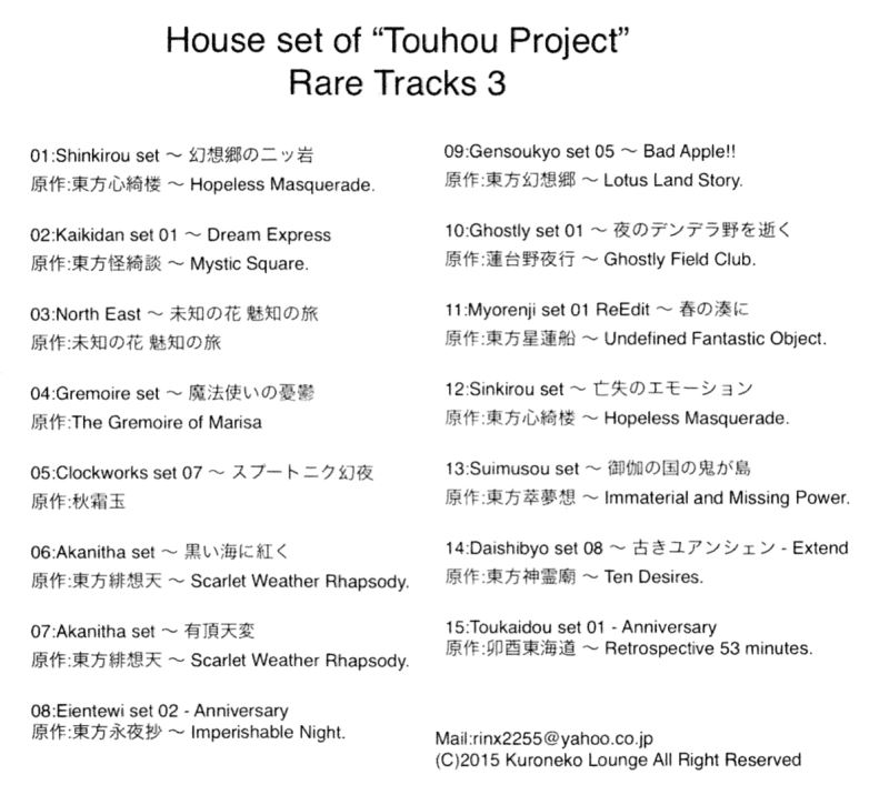 /ipfs/bafyb4ifk3u2sk3rmtg5uxxcghhvg2vao3k5aefjrf6jrppief6qrhqhyae/TLMC v5.5/[クロネコラウンジ]/2015.05.10 House set of ''Touhou Project'' Rare Tracks 3 [例大祭12]