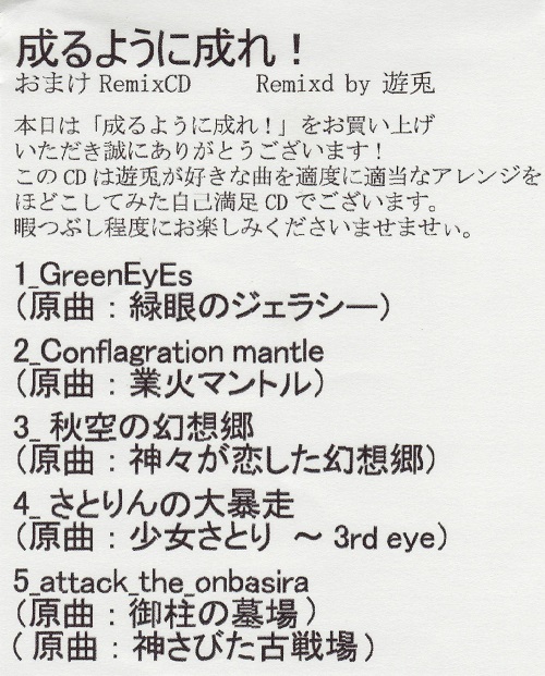 /ipfs/bafyb4ifk3u2sk3rmtg5uxxcghhvg2vao3k5aefjrf6jrppief6qrhqhyae/TLMC v5.5/[PROMINENCE]/2009.06.21 成るように成れ!おまけRemixCD [第一回東方崇敬祭]